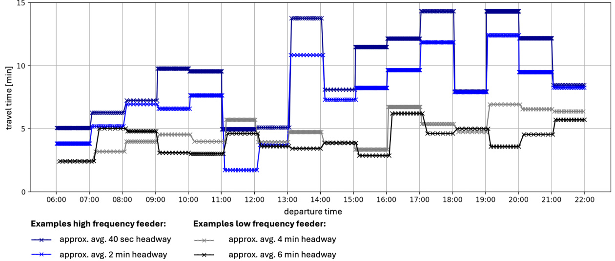 - 解读:验证虚拟线路生成方法能反映SMS服务实际运行节奏,头车间隔从2分钟到6分钟不等,旅行时间具备明显时段变化。