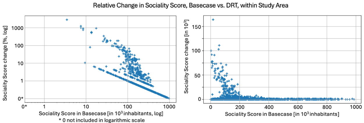 - Figure 9:基线PT与PT+SMS混合系统社会性指标(可达人数)的相对与绝对改善,散点表示各区域。