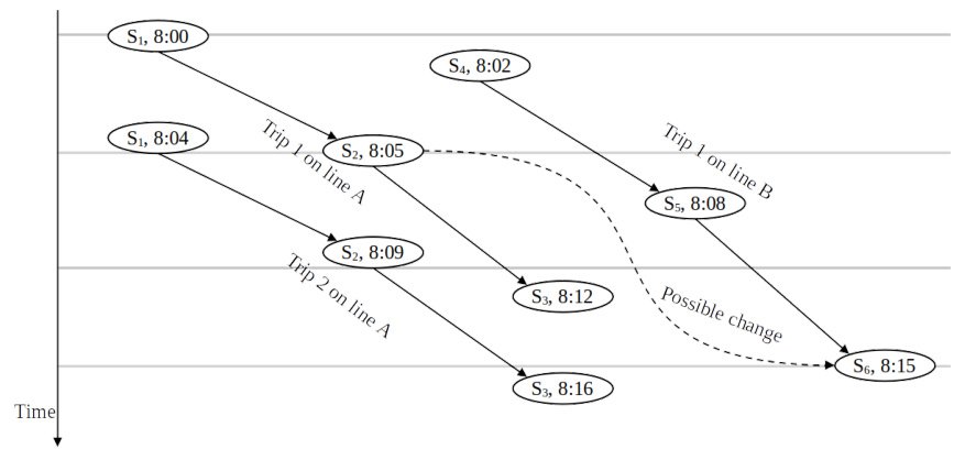- 描述:展示时间扩展图模型示例,两个PT线路A和B的三个行程上的关键停靠时刻节点,以及线路间转换可能性(步行切换)。