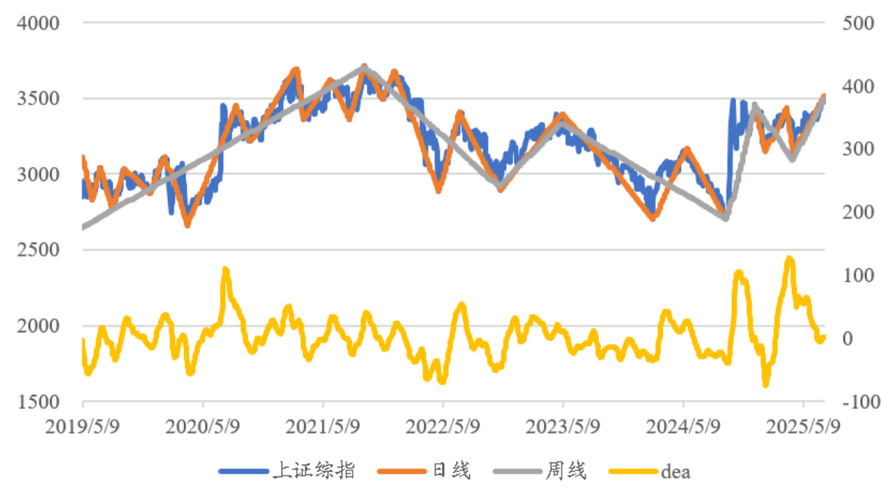- 描述:展示2019年至2025年上证综指的日线价格走势(蓝线)与周线走势(灰线),及dea指标(黄线)。