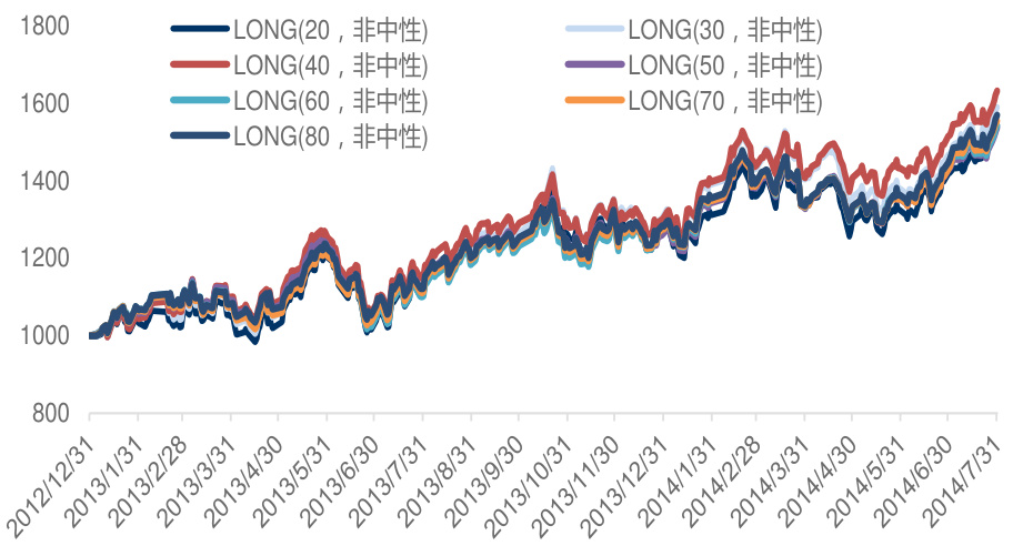 固定股票数量下,非中性及中性策略净值走势。非中性策略20-80之间表现相差不大,中性策略则在60只股票时表现最佳,20只时最差。