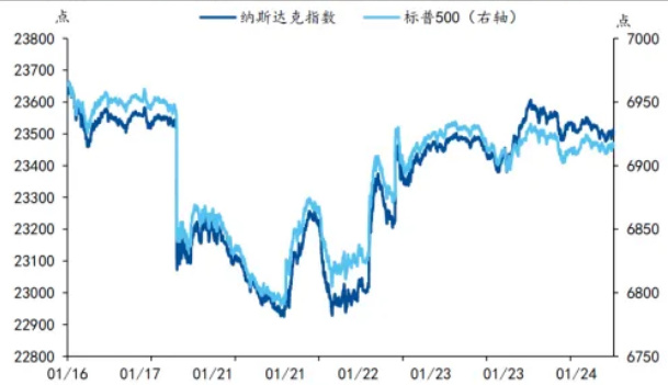 描述:图1展示纳斯达克指数与标普500在2026年1月16–24日的盘面变动,明显可见1/17出现大幅下行后在1/23左右回升至周初水平。此图支撑文本中“特朗普事件引发短期下挫但随后在言论逆转后回弹(TACO)”的叙述;它显示市场对政策消息的高敏感性与短期波动性,但并不能说明中长期风险偏好的根本改变。作者据此得出美股虽回弹但避险资产(贵金属)仍走强的结论。[page::2]