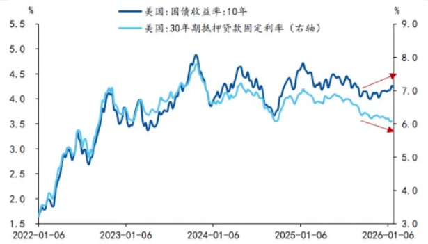 描述与解读:图6显示2022–2026年各周初请失业金人数季节性波动,2026年的初请值(红线)处于与其他年份相近水平,支持“初请符合季节性”结论;图7显示持续申领人数处于高位(2026蓝线明显较高),支撑“再就业难度仍高”的判断;图8显示MBA购买与再融资指数的分离走势(再融资显著高于购买),图9显示30年抵押贷款固定利率约6.1%,与美债收益率并列展示,表明住房融资成本处于高位。总体来看,这些图表支撑作者关于美国劳动力市场、住房融资与消费信心的细致短期判断,并提示若利率持续高位或住房成交可能继续受压。[page::3] [page::4]