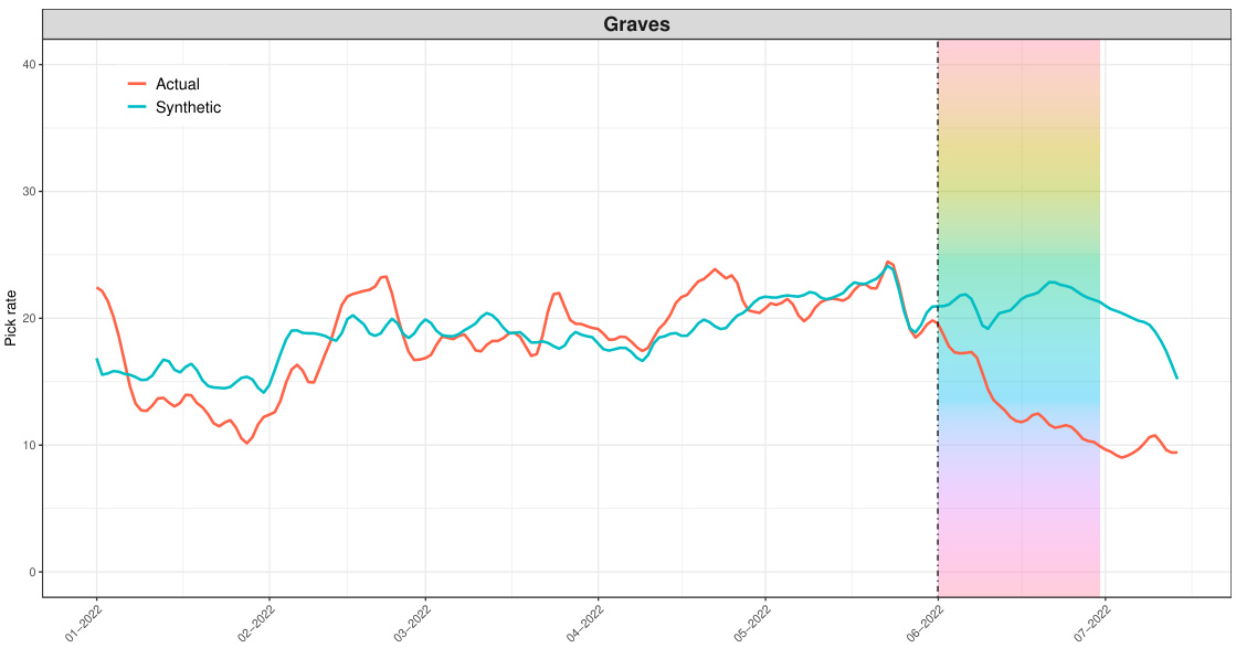 - 通过加权其他角色组成合成对照,精确拟合出柜前Graves选择率趋势,用以估计出柜后若无出柜事件Graves选择率的假设轨迹。