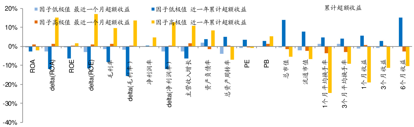 图1中显示,低极值成长因子(如delta(ROE)、delta(ROA))组合长期累计超额收益较好,高极值动量与换手相关组合近一月收益偏负,反映市场近期对高换手、高动量组合的风险偏好降低。
