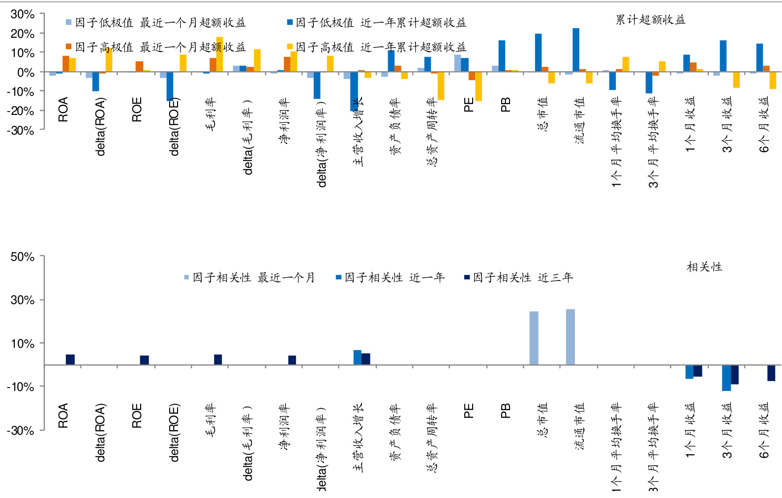 图2清晰展现沪深300中高PB组合一个月及一年超额收益明显为正,高PE组合超额收益为负且相关性偏弱,说明在大盘中PB因子仍具选股价值,而传统PE因子近期表现不佳。