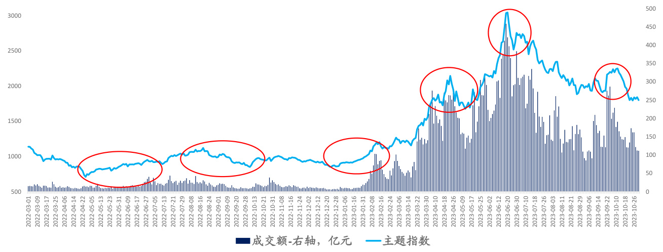 展示2022-2023年期间某主题指数的走势(蓝色折线,左轴)和成交额(柱状图,右轴),多次回调阶段(红圈)对应成交额波动。反映典型主题指数行情的起伏与交易活跃度关联。