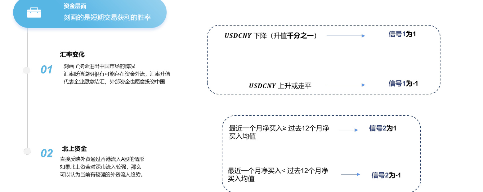 - 汇率变化和北上资金流向短周期刻画资金进出,增强信号准确度。