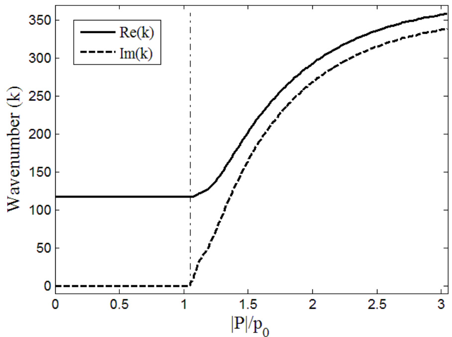 - 趋势解读:虚部波数从零开始,在超过Blake阈值处迅速增大,与实部波数相近,说明气泡对声波阻尼的非线性贡献显著且压力相关。