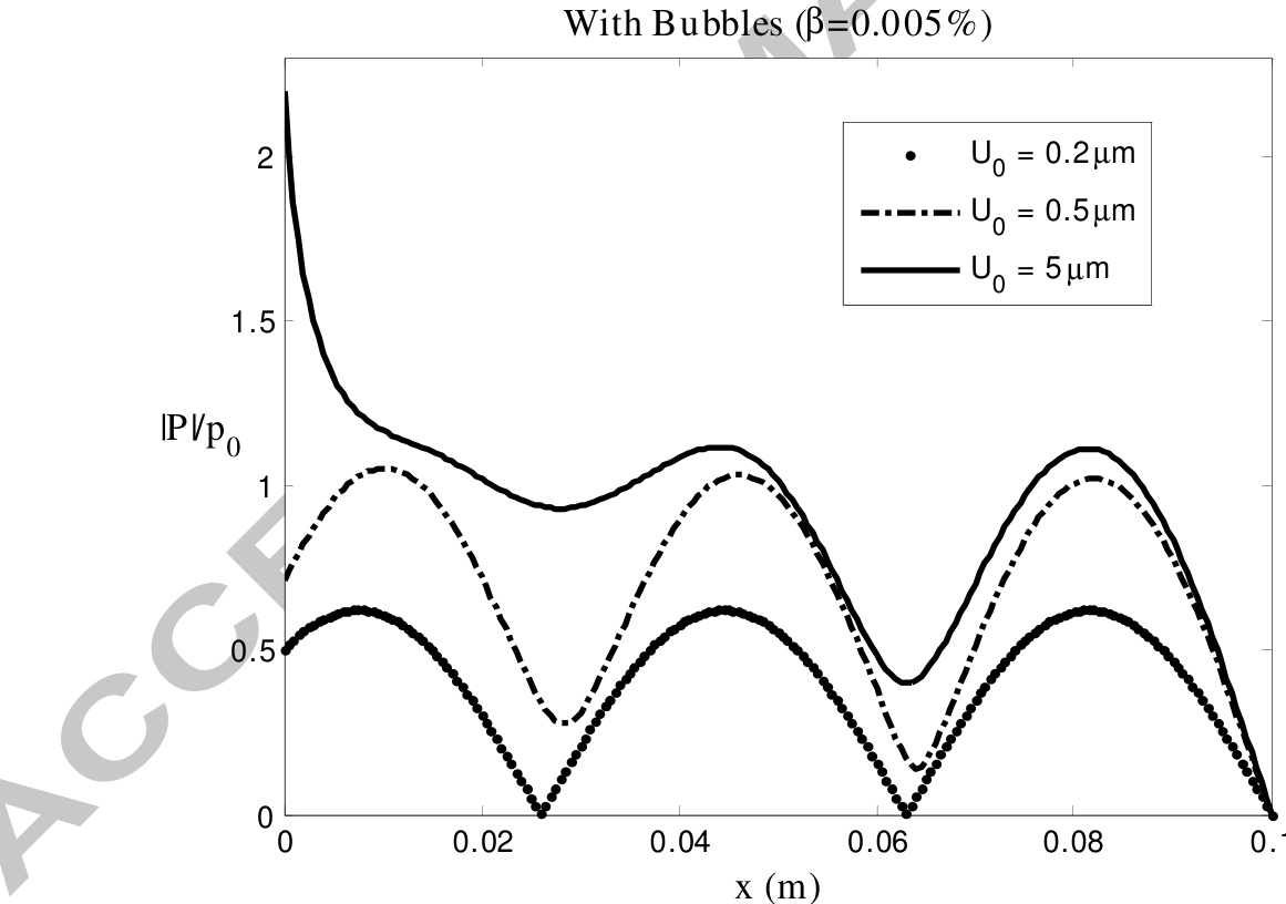- 内容描述:同一环境下非线性模型1D压力剖面,三条曲线对应不同激励位移幅度$U_0=0.2,0.5,5~\mu m$。体积分数0.005%。