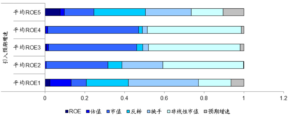 - 图1展现低ROE组对预期PE带来较大风险溢价贡献,图3与图4显示高ROE组对预期增速与预期ROE的风险溢价较强,体现风险-收益权重动因不同。