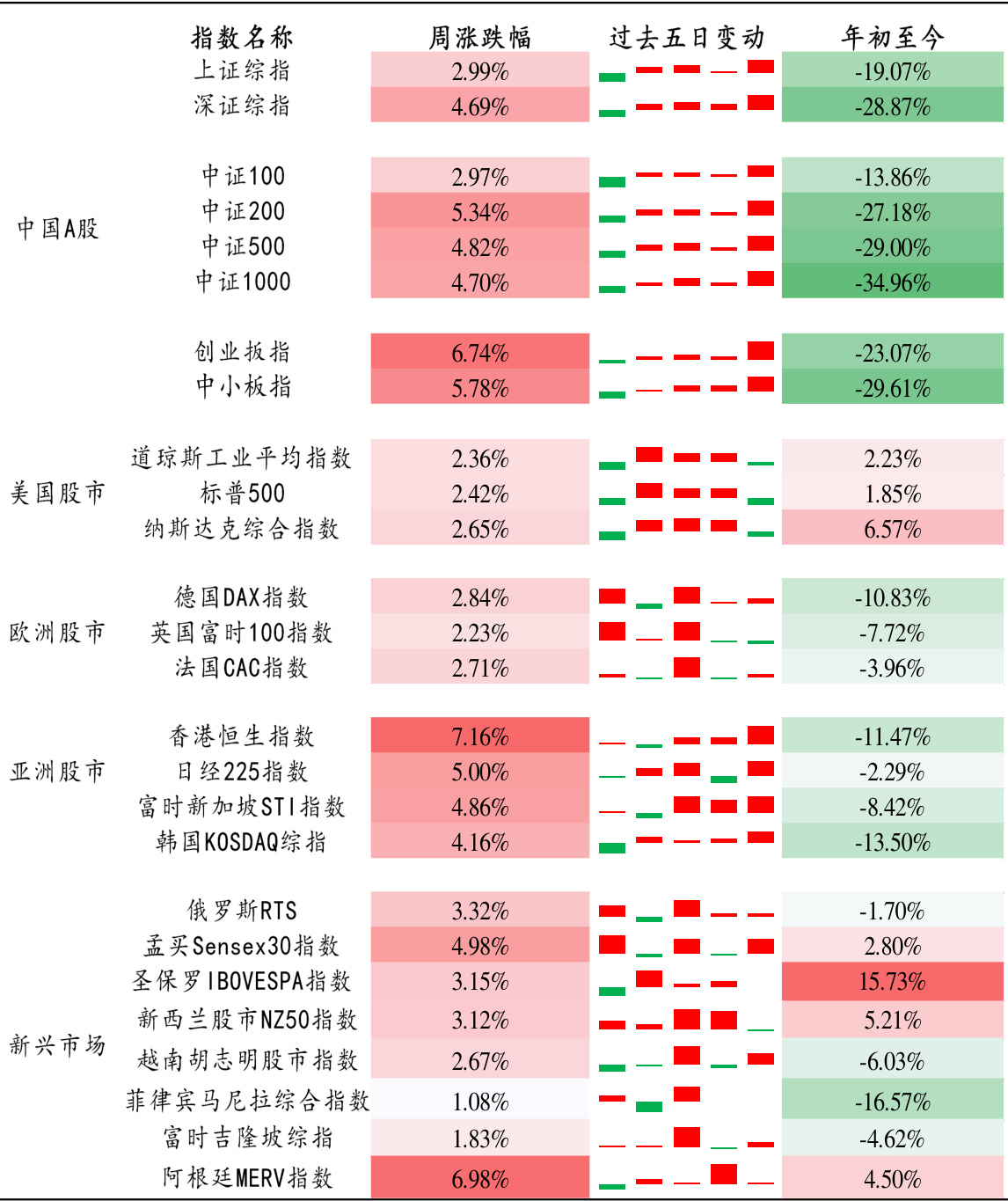 - 当前宏观市场情绪高涨,全球股市普遍回暖,A股尤其表现积极,多个指数上涨,本周上证综指上涨2.99%,创业板指涨幅达6.74%。