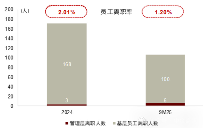 - 公司2024-2025年员工离职率仅1.2%-2.01%,在同行中处于极低水平,大大降低人力资源成本。