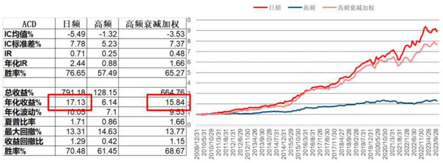 - 图表显示日频因子年化收益17.13%,高频6.14%,高频衰减加权15.84%;