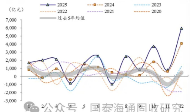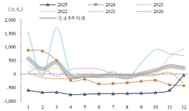 图示各年逐月外汇占款环比变化,2025年整体呈相对为负的走势,12月亦未显著正向投放。[page::2]