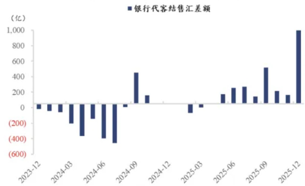 该柱状图展示自2023-12起每月的银行代客结售汇差额,2025年12月的柱显著高出此前月份并接近1000亿美元水平,直观上证实了文本所述的异常顺差。[page::1]
