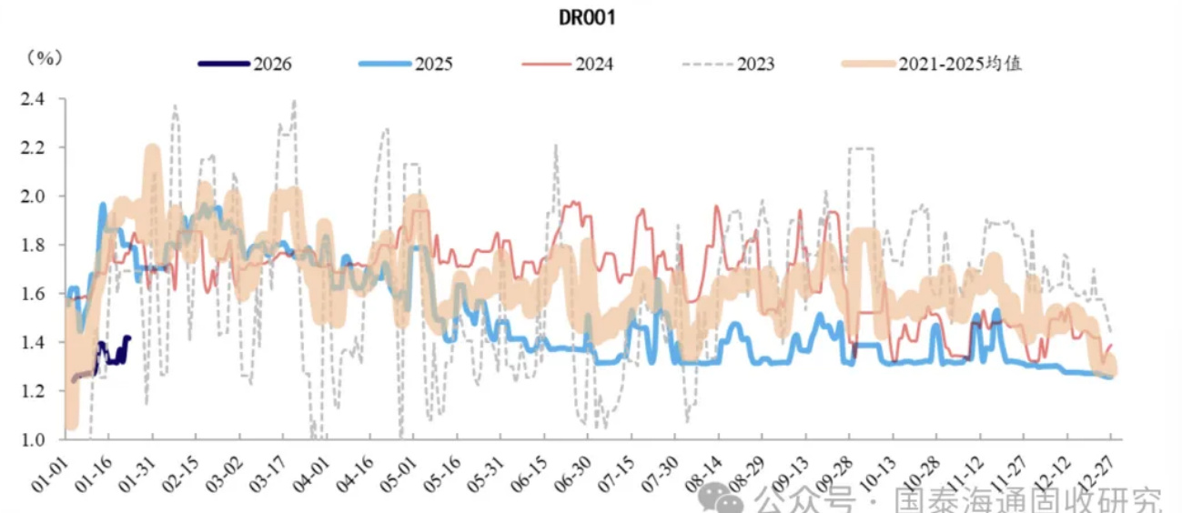 折线表明2025年下半年人民币对美元及CFETS一篮子货币均出现持续升值,支持结汇动能与市场情绪的叠加解释(企业与资本双方可能加速入场/结汇)。[page::3] - 图6(DR001与央行调控):