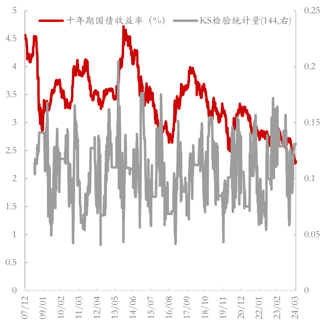 - 图12、13显示KS统计量与国债收益率走势关系,KS统计量高点暗示走势反转风险;