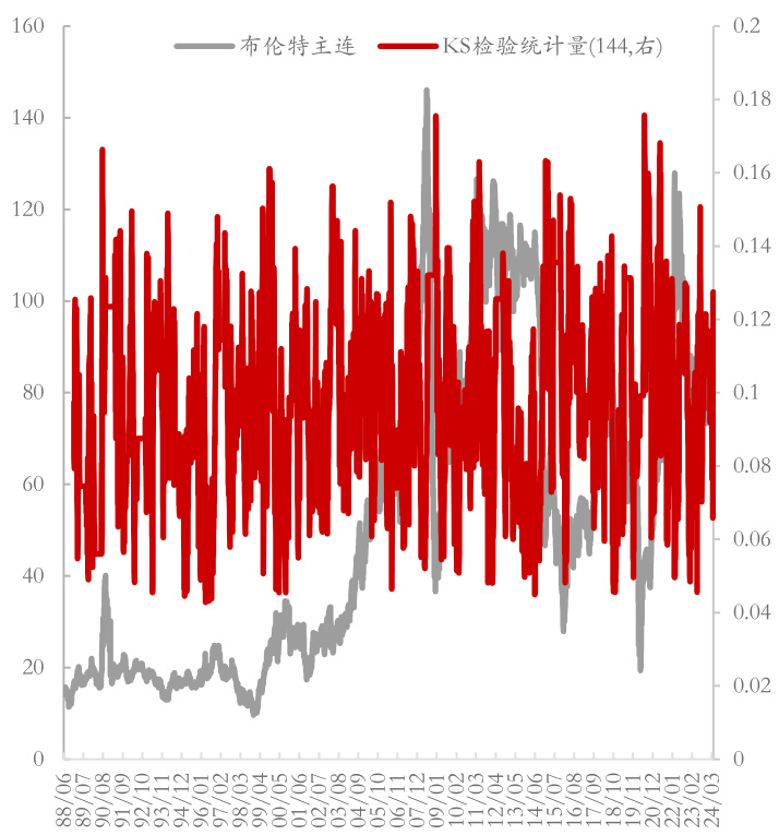 - 图3、4灰色线KS统计量曲线对比红色沪深指数价格,KS统计量高点前后多出现价格调整,指示市场临界转折;