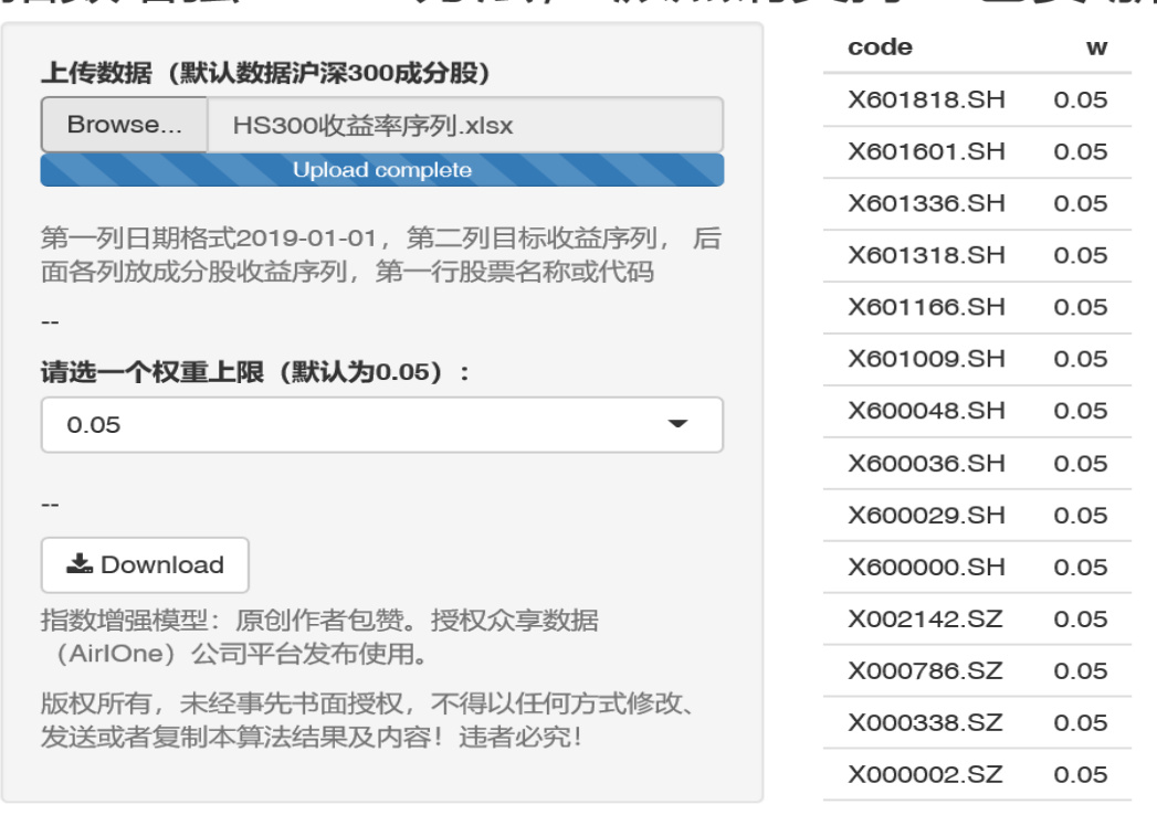 - 描述:上传完数据后选择权重上限,并显示部分组合权重,支持一键下载。