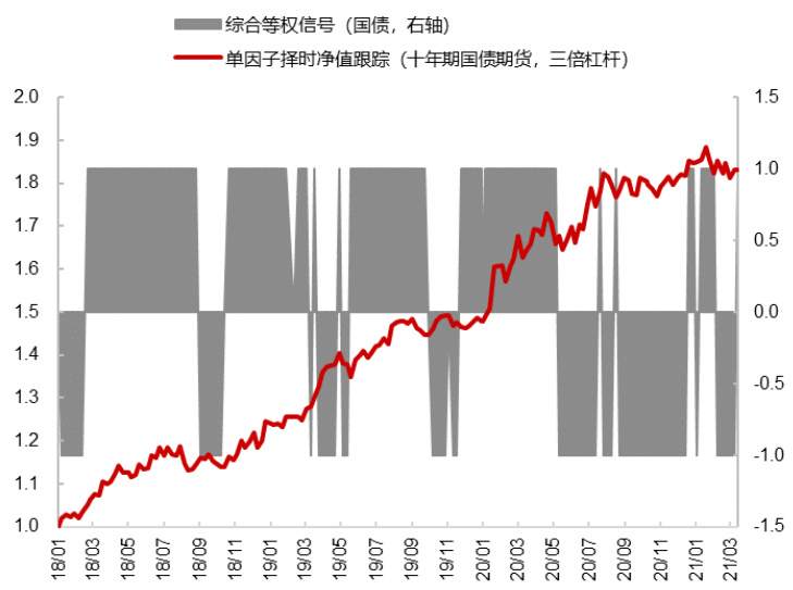 - 利用十年期与五年期国债期货的三倍杠杆进行回测,显示净值在2018年至2021年间稳步上升,综合择时信号(灰色区域)与净值走势(红线)高度相关,体现模型择时效果良好。