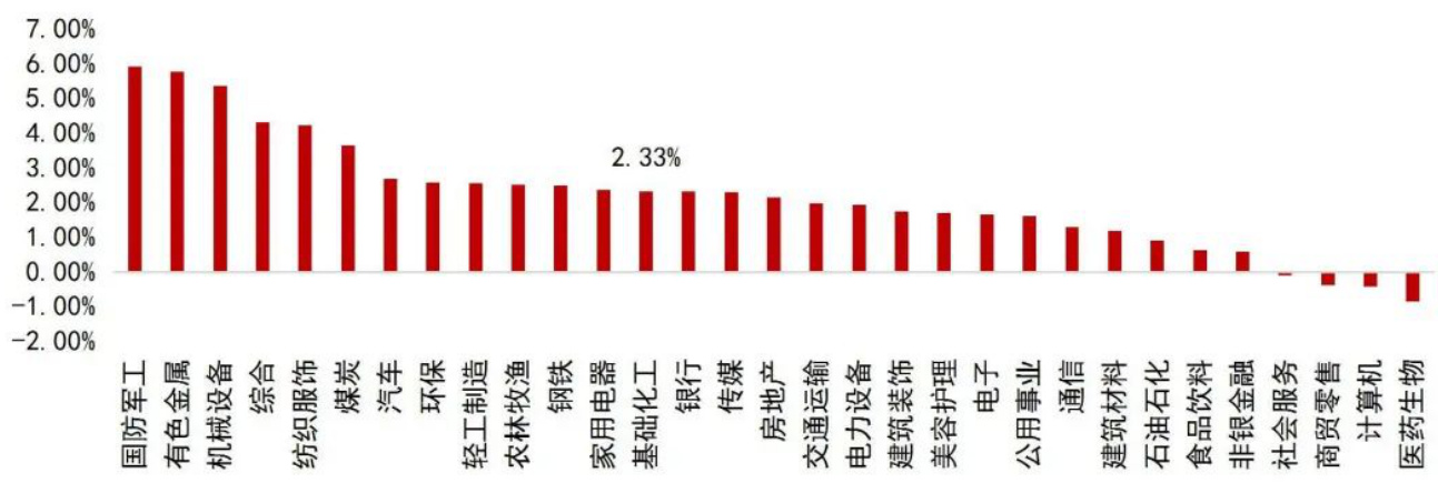 - 基础化工与新材料行业中,国防军工、有色金属及机械设备涨幅居前。