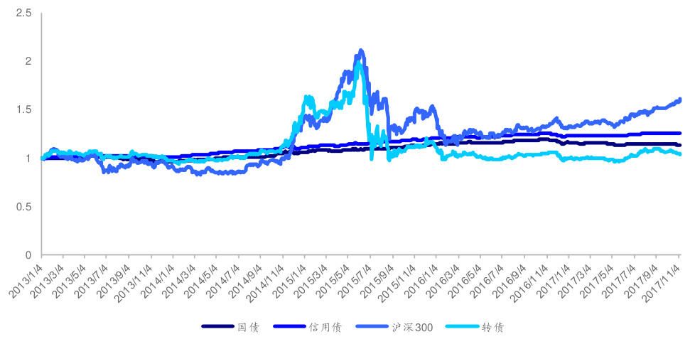 - 选取常见四类资产指数:中债国债指数(利率债)、中债信用债指数、沪深300指数(股票)以及中证转债指数(可转债)。