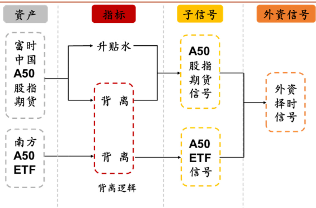 - 外资择时模型综合运用富时中国A50股指期货和南方A50ETF背离指标构建择时信号。