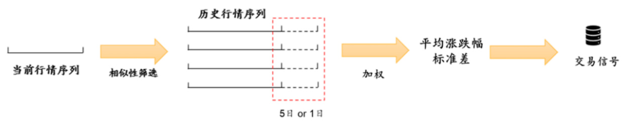 - 利用动态时间弯曲(DTW)算法度量当下与历史指数行情的相似度,筛选若干高相似历史片段并计算其未来若干日平均涨跌幅和波动率,综合判断后给出交易信号。(图6)