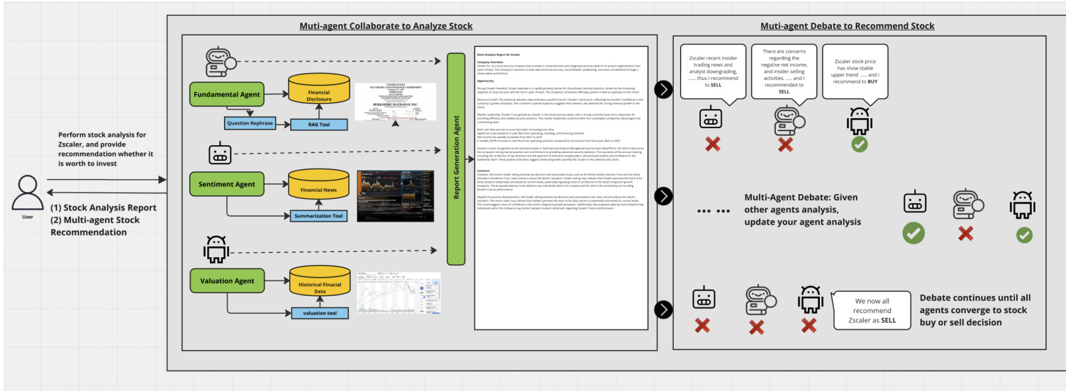 - 主题: 本文研究了基于大型语言模型(LLM)的多智能体系统在股票研究和股票组合构建中的应用,强调通过多角色分工和智能体间协作与辩论提升股票筛选和投资决策质量。