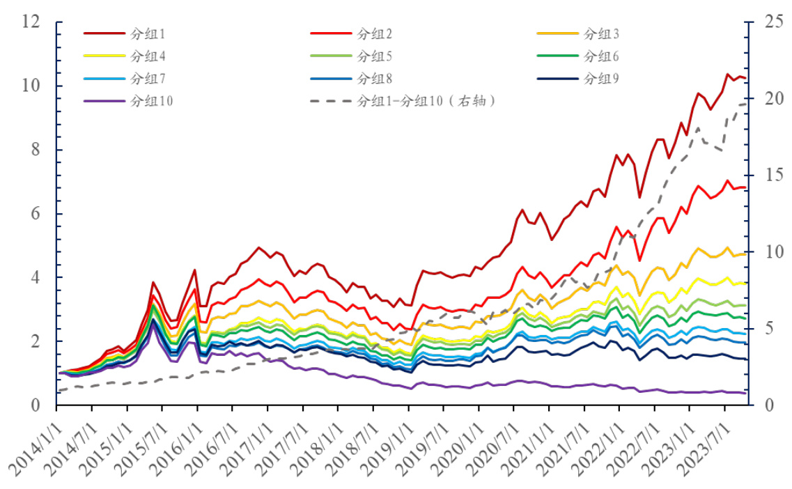 图1:传统日内换手率itaTurn20因子10分组及多空对冲净值走势(2014-2023)