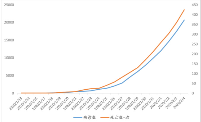 | 图1 | 2003年非典累计确诊与死亡病例数 | 确诊数约5000,死亡数约350,病例增速较缓慢 | 显示非典疫情发展趋势,为和新冠比较做基础。 |