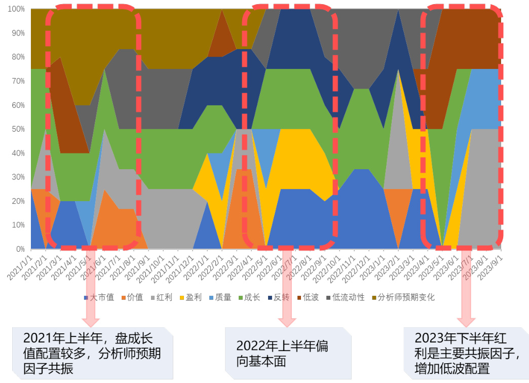 - 2021年以来因子选择趋势中沪深300以红利和低波共振明显,阶段切换对应基本面因子和分析师预期因子变化(图32);中证500则以低流动性为主要共振因子,兼顾红利低波(图33)。