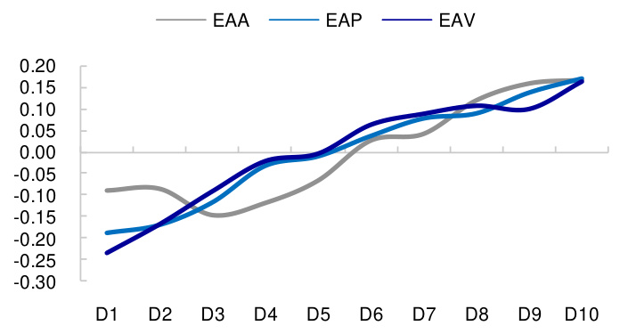 - EAV与EAP表现出更平滑、渐进的收益提升,EAV最高组(D10)年化超额收益将近6%,低组近-5%。
