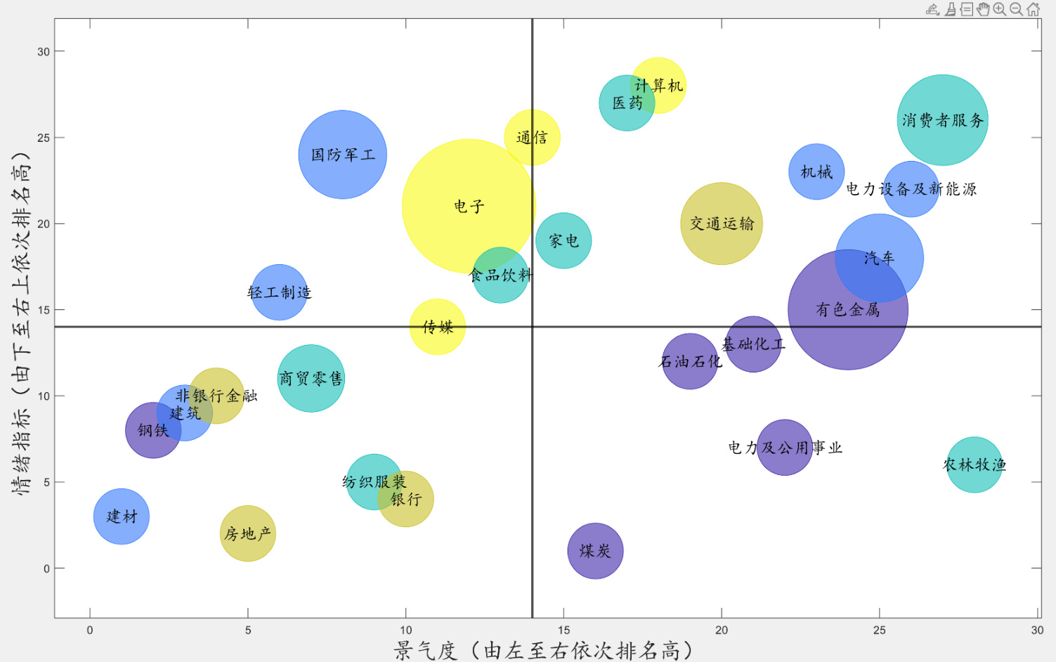 - 横轴为景气度排名,纵轴为情绪指标,气泡大小表资金流,颜色编码行业属性
