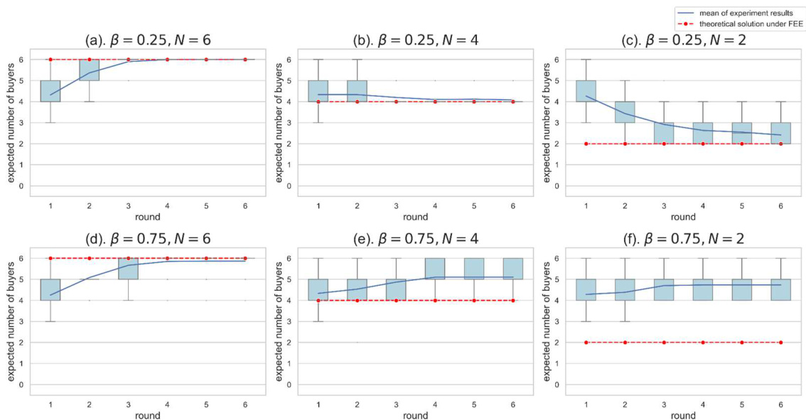 [page::3]- 描述:六个子图显示在固定价格下,不同β与目标N组合(β=0.25 的 N=6,4,2 与 β=0.75 的 N=6,4,2)随回合的期望演化(蓝线+箱线),红点为理论值。[page::3]