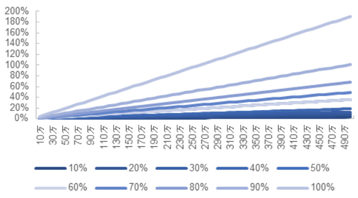 - 随着下单金额增加,四个冲击指标的变化幅度及差异急剧加大,需求超出市场成交规模时指标值突破100%,表示模型预测边界已达到极限,准确率下降;