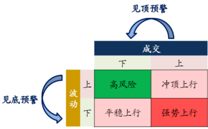以波动率和成交量双指标划分市场状态,标明不同象限对应预期收益状态,当前位于波动率低、成交量上升区间,解释为多头阶段,但伴随波动率下降,建议警惕短期调整。