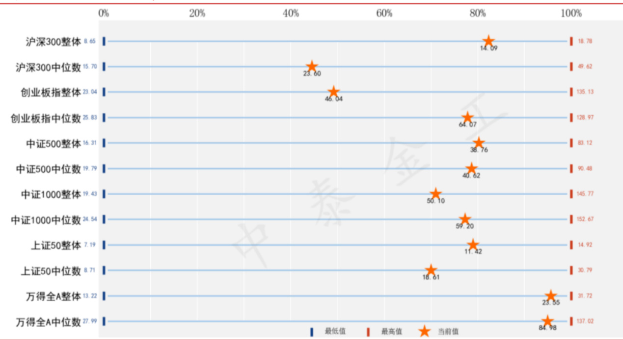 图表展示多个指数(如沪深300、创业板/中证500/中证1000/上证50/万得全A等)PE当前值与历史分位位置,星号表示当前分位位置,蓝线与红端分别为最低/最高历史值,图下方标注为当前PE数值。图中显示万得全A等指标PE处于高分位(报告文字指出全A PE约在95分位)[page::1]。