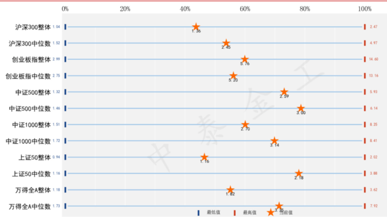 图表展示多个指数(如沪深300、创业板/中证500/中证1000/上证50/万得全A等)PE当前值与历史分位位置,星号表示当前分位位置,蓝线与红端分别为最低/最高历史值,图下方标注为当前PE数值。图中显示万得全A等指标PE处于高分位(报告文字指出全A PE约在95分位)[page::1]。 - 解读:该图支持“市场PE高位”的断言,且不同市值层次与板块PE差异明显(如创业板PE高、上证50低),这提示风格轮动与风险分散的重要性[page::1]。