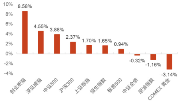 - 创业板指本周上涨8.58%,涨幅最大;黄金价格下跌3.14%。