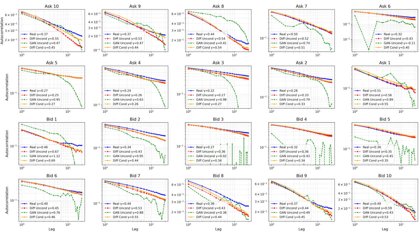 - 自相关衰减验证显示扩散模型能合理复制成交量的幂律记忆特性,优于GAN。
