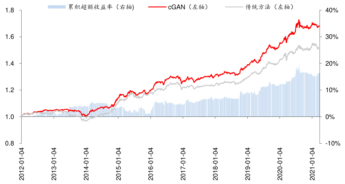 - 淡蓝色柱状为累积超额收益率,显示cGAN超越传统方法的绝对收益率优势明显。
