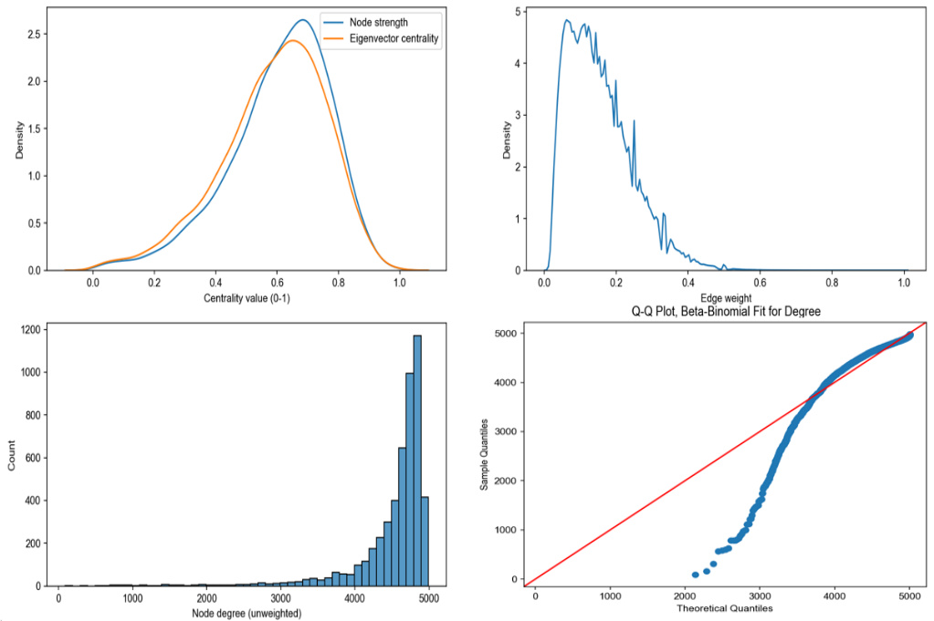 - 描述:节点强度与特征向量中心性密度曲线(左上)、产品间相关权重分布(右上)、节点无权重度分布(左下)、以及度分布的Beta-binomial拟合Q-Q图(右下)。