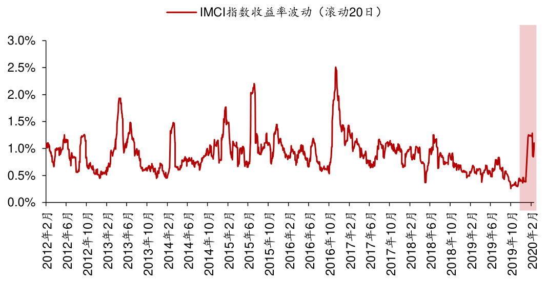 - 图表5:IMCI 指数收益率波动率(20日滚动)