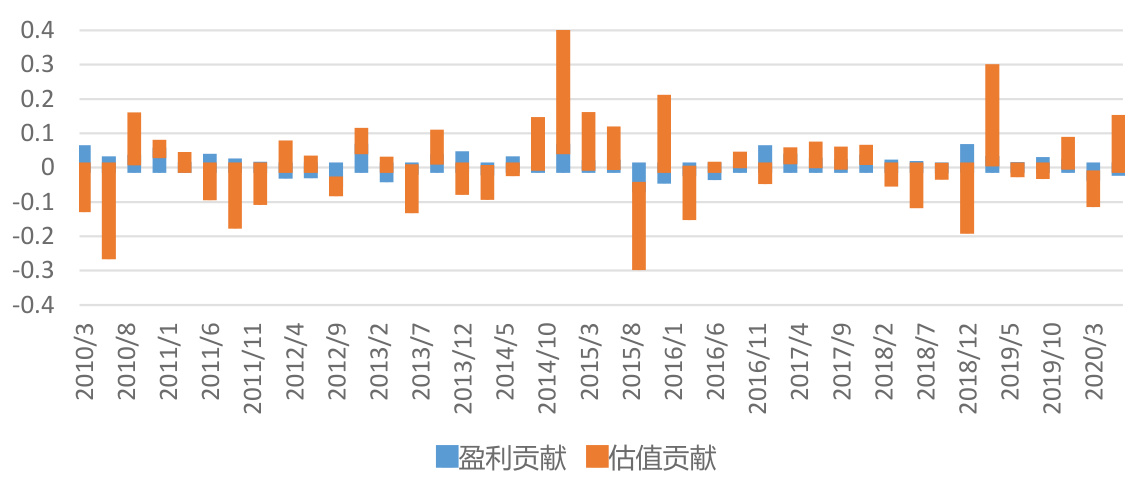 - 统计2010年-2020年二季度季度数据发现,估值贡献为A股绝大部分收益来源,且A股市场波动的主因是估值变化,盈利变动相对较小。