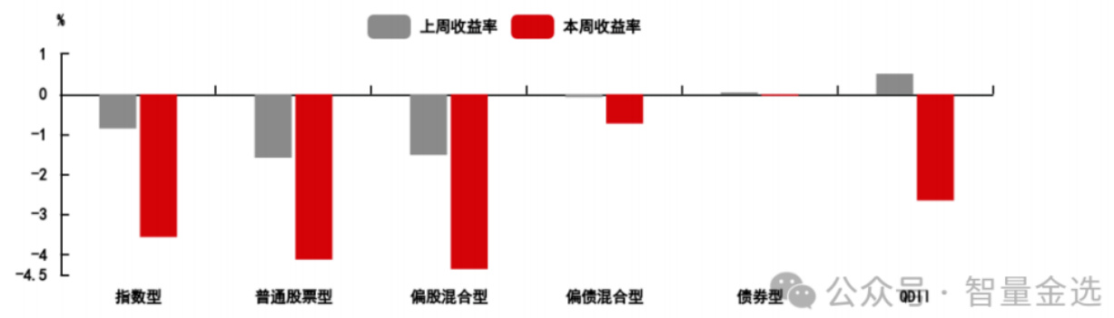 - 三类权益类基金涨幅显著回落,且本周跌幅明显大于上周。