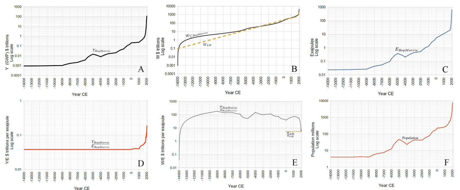 六个面板分别显示从公元0年起的GDP($Y$)、历史累积财富($W$)、年度能耗($E$)、$Y/E$比率、$W/E$比率及人口。