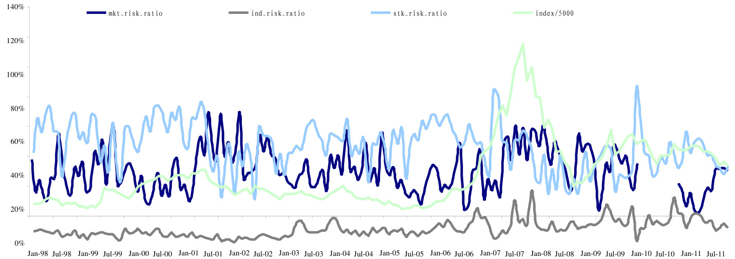 - 预测:2011年12月市场风险占比提升至37%,行业风险降低,非系统性风险相对系统性风险比下降,提示市场结构风险变化。