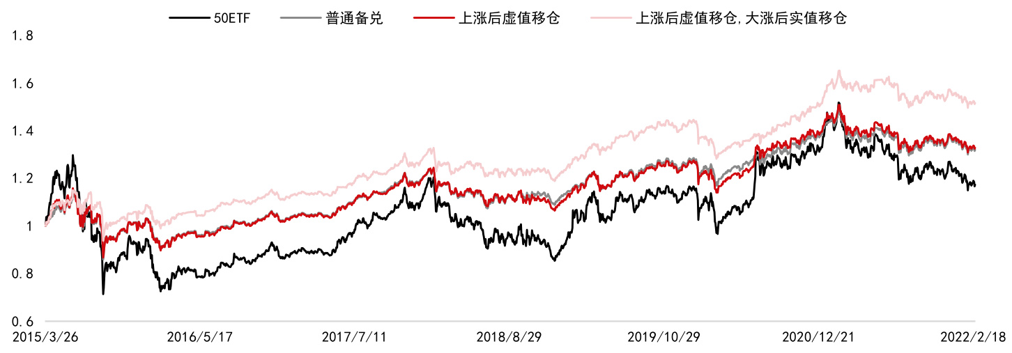 并进一步提出四种具体调仓方案,分别结合市场上涨或下跌场景,目标是通过调整期权行权价或增加看跌期权降低策略风险,提升收益。策略实际测试均以上证50ETF期权为标的,回测周期全覆盖期权上市以来至2022年2月。